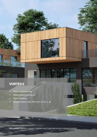 42 42 DUROPAL // EXTERIOR COMPACT VORTEILE Witterungsbeständig Elektrostatisch ableitend Hoch belastbar Brandverhalten nach EN 13501-01: B-s1, d0 PFLEIDERER DUROPAL COMPACT R20038 CAHLET OAK NATUR UND U16058 BE ROOTED