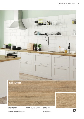 15 ARBEITSPLATTEN // HOLZ 15 R20128 RT Sonoma Eiche hell Formate: 4100 x 600 x 39 mm Profil: Quadra Oberfläche: Rustic Wood 4100 x 900 x 39 mm 3 mm Radius passendes Zubehör: Kantenmaterial Koordinate: Q 1