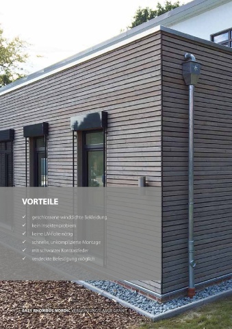 VORTEILE geschlossene winddichte Bekleidung kein Insektenproblem keine UVFolie nötig schnelle, unkomplizierte Montage mit schwarzer Kontrastfeder verdeckte Befestigung möglich EASY RHOMBUS NORDIC VERGRAUUNGSLASUR GRANIT