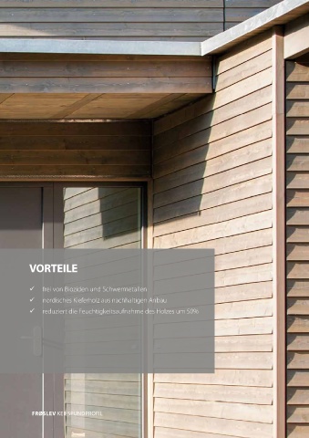 VORTEILE frei von Bioziden und Schwermetallen nordisches Kieferholz aus nachhaltigen Anbau reduziert die Feuchtigkeitsaufnahme des Holzes um 50% FRØSLEV KEILSPUNDPROFIL