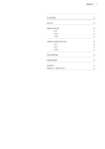 INHALT 3 PFLEIDERER 04 WESTAG 06 ARBEITSPLATTEN 08 – UNI 10 – HOLZ 14 – STEIN 18 COMPACT ARBEITSPLATTEN 24 – UNI 26 – HOLZ 30 – STEIN 32 FENSTERBÄNKE 36 OBERFLÄCHEN 38 ROGSHOP 40 PINNCALC / PALETTE CAD 42