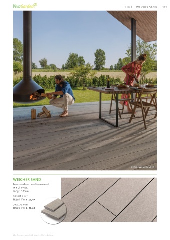 Weicher Sand CEDRAL | WEICHER SAND 129 Cedral Weicher Sand WEICHER SAND Terrassen dielen aus Faserzement mit Clip-Nut, Länge: 3,15 m 20 x 84,5 mm TR20S lfm € 16,49 20 x 175 mm TR20B lfm € 26,49 alle Preisangaben inkl. gesetzl. MwSt. in euro.