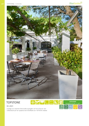 topstone 150 TOPSTONE | KERAMIK tOPStONe Grau tOPStONe Produktmerkmale s. S. 167 KERAMIK 60 x 60/2 Geprägt von dezenter Steinstruktur spiegeln sich feine Muster und Farbverläufe auf der dynamischen Oberfläche der TOPSTONE wieder.