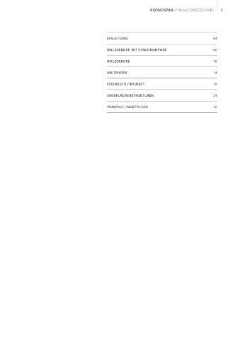 KRONOSPAN // INHALTSVERZEICHNIS 3 EINLEITUNG 04 HOLZDEKORE MIT SYNCHRONPORE 06 HOLZDEKORE 10 UNI DEKORE 14 FEELNESS ULTRA MATT 18 OBERFLÄCHENSTRUKTUREN 24 PINNCALC / PALETTE CAD 26