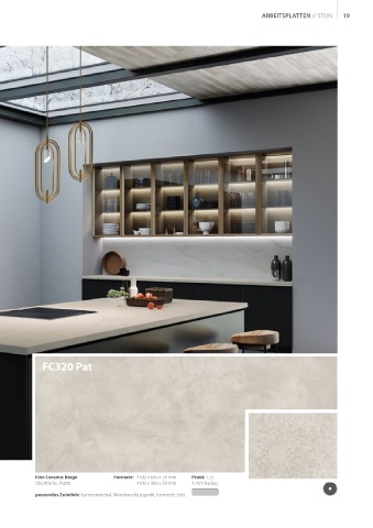 ARBEITSPLATTEN // STEIN 19 FC320 Pat Fine Ceramic Beige Formate: 4100 x 600 x 39 mm Profil: 133 Oberfläche: Piatta 4100 x 900 x 39 mm 4 mm Radius passendes Zubehör: Kantenmaterial, Wandanschlussprofil, Formteile-Sets