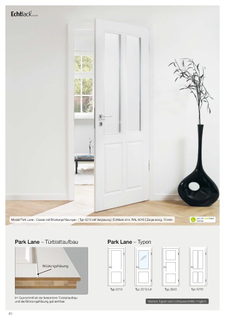 Modell Park Lane - Classic mit Brüstungsfräsungen | Typ 4210 mit Verglasung | Echtlack ähnl. RAL 9016 | Zarge eckig, 70 mm auch mit Smartkante