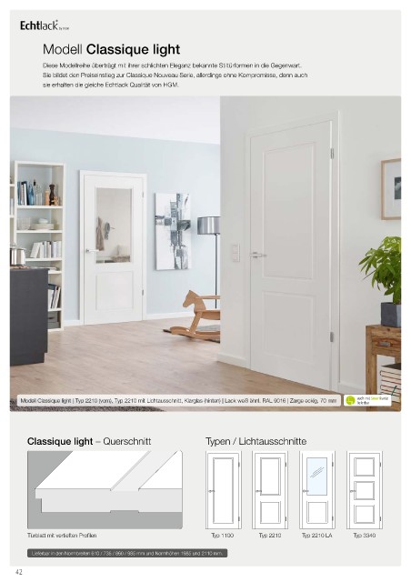 Modell Classique light | Typ 2210 (vorn), Typ 2210 mit Lichtausschnitt, Klarglas (hinten) | Lack weiß ähnl. RAL 9016 | Zarge eckig, 70 mm auch mit Smartkante