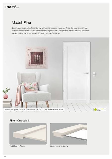 Modell Fino | gefälzt | Typ 1100 | Echtlack ähnl. RAL 9016 | Zarge mit Smartkante, 60 mm auch mit Smartkante