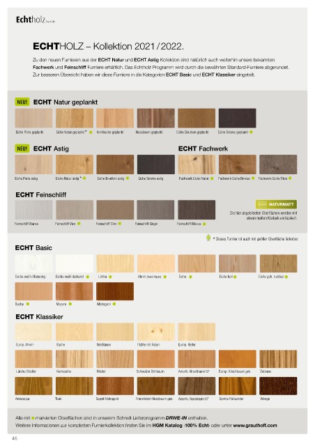 Fachwerk und Feinschliff Furniere erhältlich. Das Echtholz Programm wird durch die bewährten Standard-Furniere abgerundet.