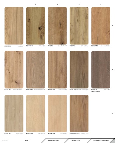 D4225 OV Eiche Artisan Natur D3823 OW Steineiche New York R20038 NW Chalet Oak natur R37017 NW Rüster Salisbury grau D4100 CS Ulme Coffee
